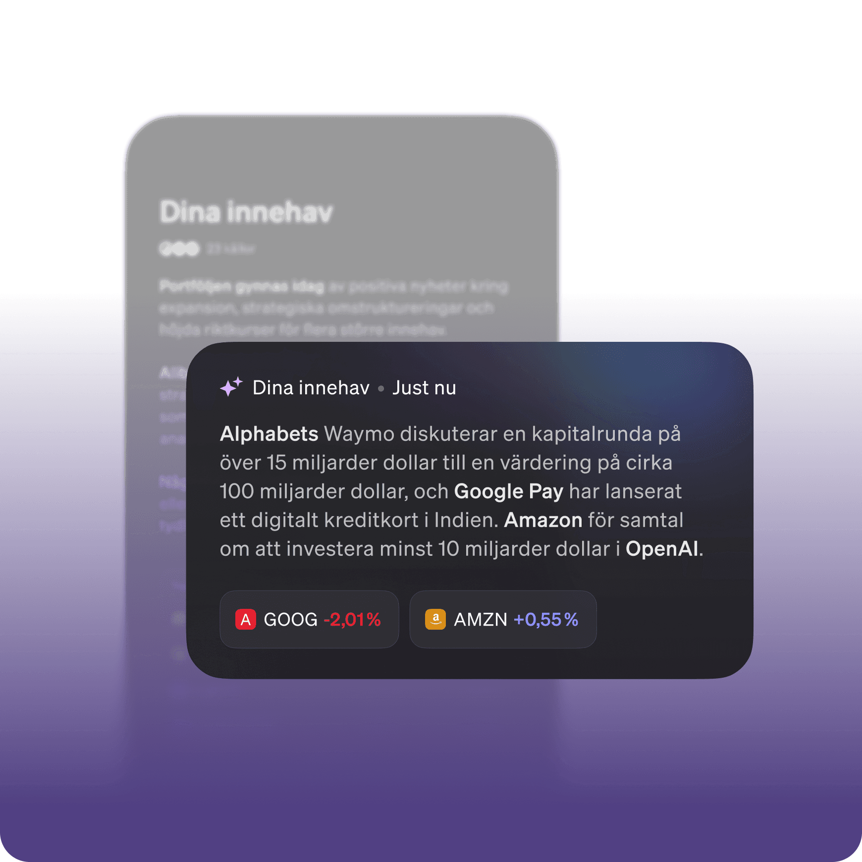 Hos oss får du stenkoll utan att lägga timmar på att läsa nyheter. Vår smarta AI sammanfattar allt som hänt i din portfölj det senaste dygnet så att du inte missar något viktigt – direkt på hemskärmen.
