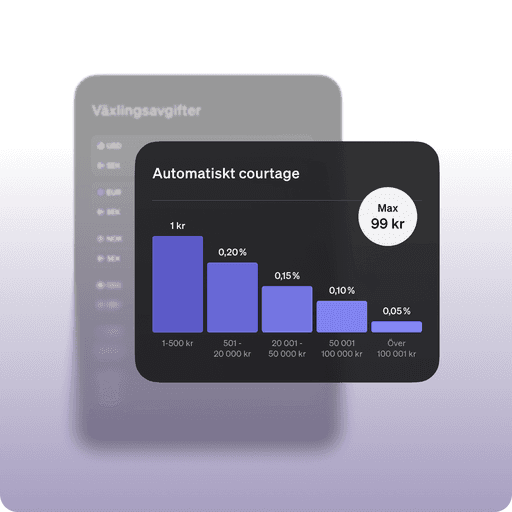 Slipp krångliga courtagemodeller som varierar från börs till börs – hos oss ser det likadant ut överallt: från 1 till 99 kr. Med vårt automatiska courtage ligger du dessutom alltid i rätt prisklass för varje transaktion, utan att behöva lyfta ett finger.