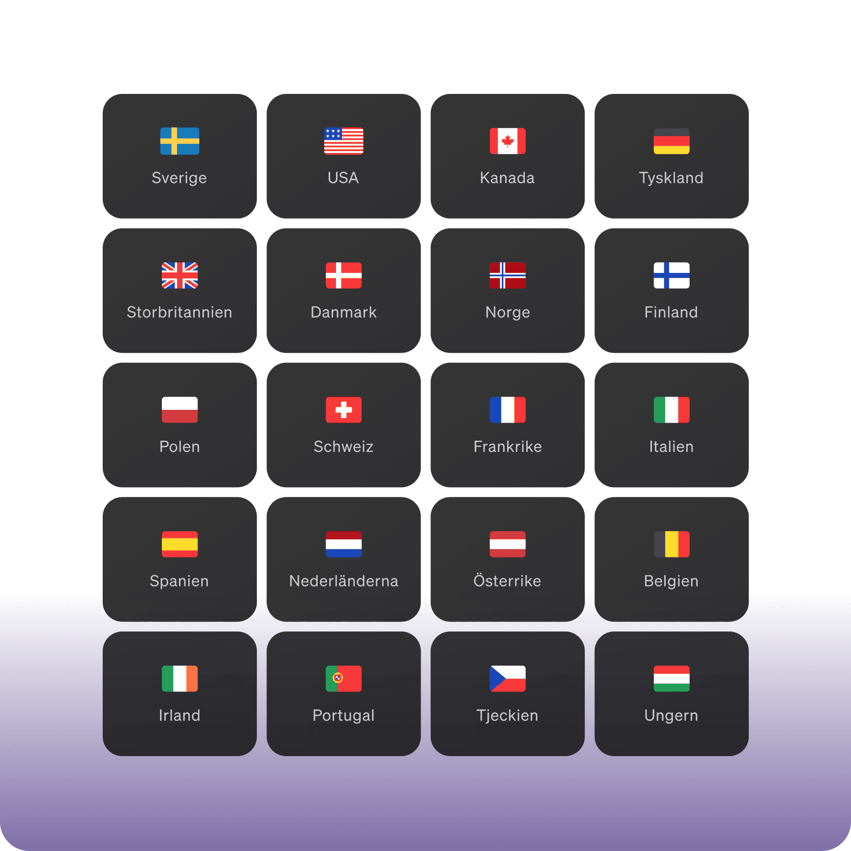 Hos oss handlar du aktier från 20 marknader – direkt i appen, utan mellanhänder. I vårt utbud hittar du aktier från Sverige, USA, Kanada, Norge, Danmark, Finland, Tyskland, Frankrike, Storbritannien, Italien, Spanien, Nederländerna, Schweiz, Irland, Belgien, Österrike, Portugal, Polen, Tjeckien och Ungern.